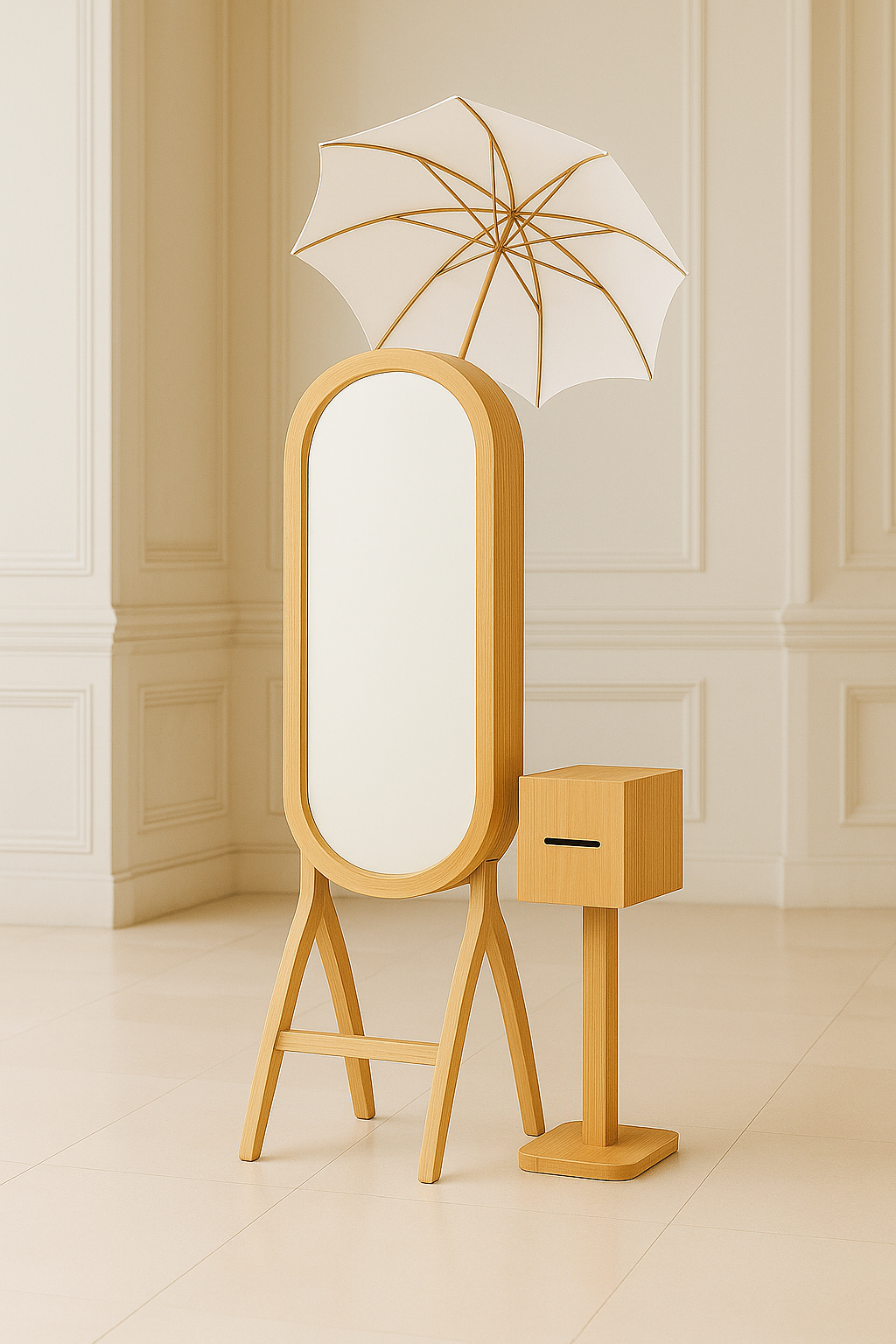 Meet Héléna — our étoile (french translation: star)! Handcrafted from premium oak with a sleek & modern design, this interactive mirror photobooth brings a timeless elegance to every celebration. Featuring a DSLR camera paired with professional studio lighting and an integrated LED ring, Héléna captures each moment with luminous clarity & poise. More than a photobooth, she’s a statement & an experience — crafted to elevate your event with effortless sophistication.